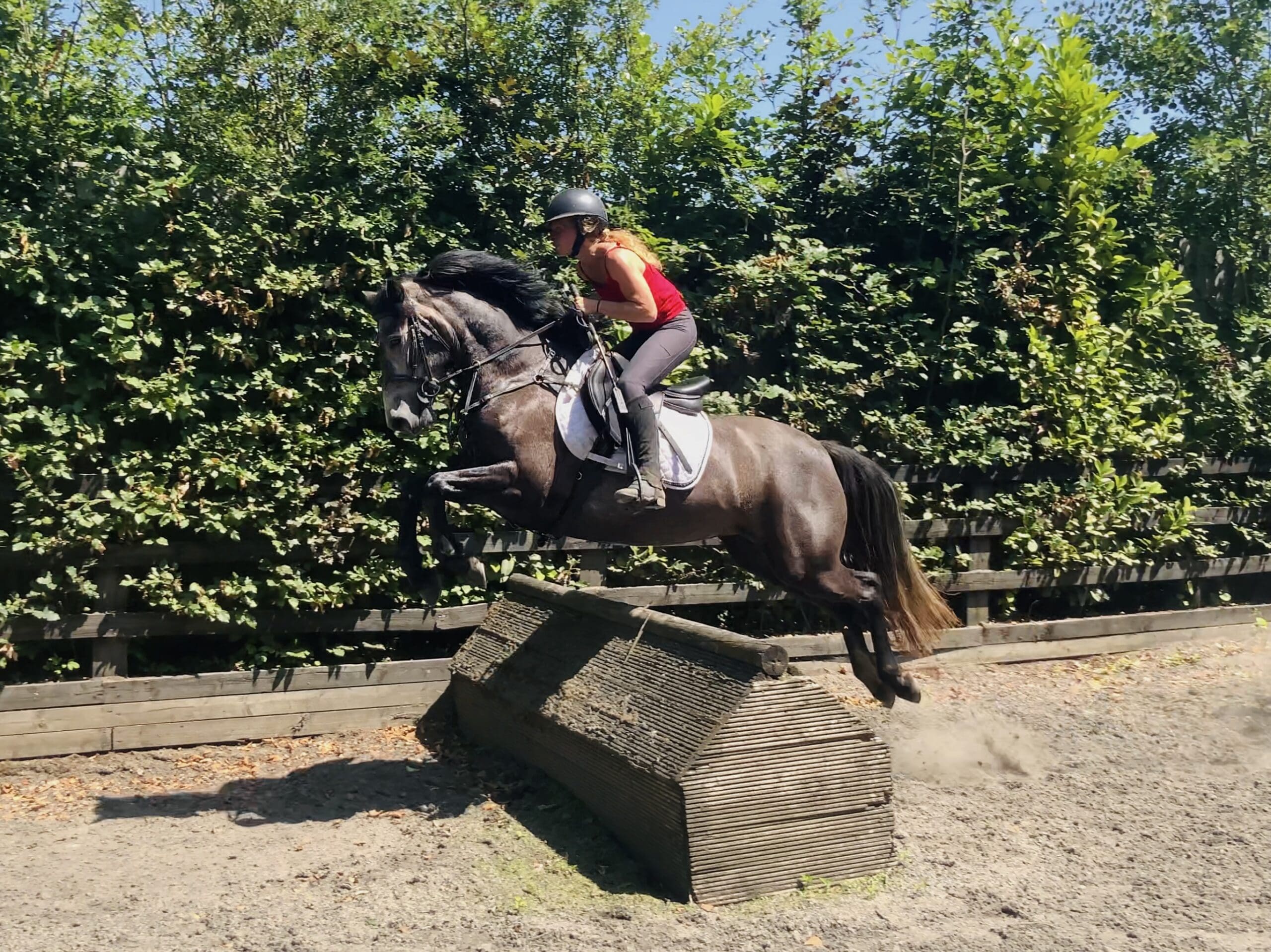 She has a soft snaffle mouth and is incredibly brave and enthusiastic to the jump. She has jumped hedges, water, drains, coffins, and full showjumping courses. She has a natural auto flying lead change and will jump from any distance. Very willing, forward, and forgiving character. Easy temperament for a teen rider to finish. Serious scope and brain for the top of the sport.